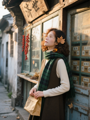 复古感与中式感交织,胶片风光影下,女子立于老药铺前,木雕风门楣与秋叶点缀,静谧质朴中透出国潮文艺气息。