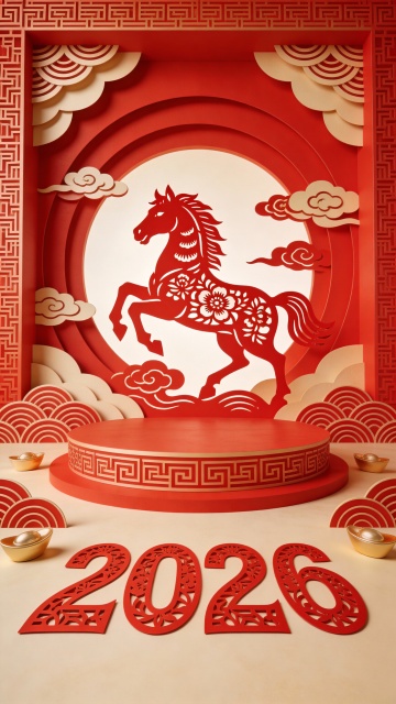 2026 丙午马年新春视觉主打新国风剪纸融合写实,以红色镂空剪纸骏马为核心,马身嵌锦鲤、祥云等纹样,矫健又通透。骏马旁搭配抱金币、持福字的 Q 版微缩人偶,宏微观对比添萌趣。金橘、葫芦、金币等吉祥符号散落浅木色桌面,与 2026 金属字自然相融。