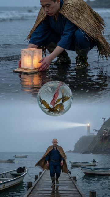 东亚风与超现实主义交织,双重曝光技法营造静谧朦胧的梦幻场景,玻璃球中封存海藻与鱼影,水彩般光影晕染,质朴人物与灯盏诉说故事感十足的海边传说。