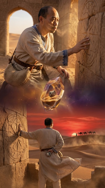 双重曝光风融合石刻浮雕,沙漠遗迹中神秘光影交织,超现实主义呈现民族古典美学,水晶悬浮于时空之间,传递梦幻与神秘感。