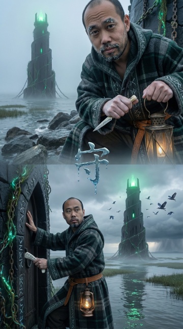 哥特风塔楼隐现雾海,液态金属文字“守”悬于空中,3D虚拟现实感十足。光影交错间,神秘与梦幻交织,金属质感服饰与朦胧环境共筑故事感十足的奇幻场景。