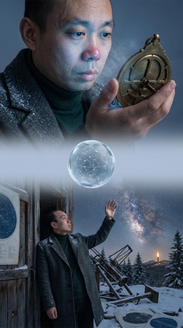 双重曝光风融合复古金属仪与星空,超现实主义呈现冬夜观星的静谧神秘感,胶片质感强化梦幻光影氛围。