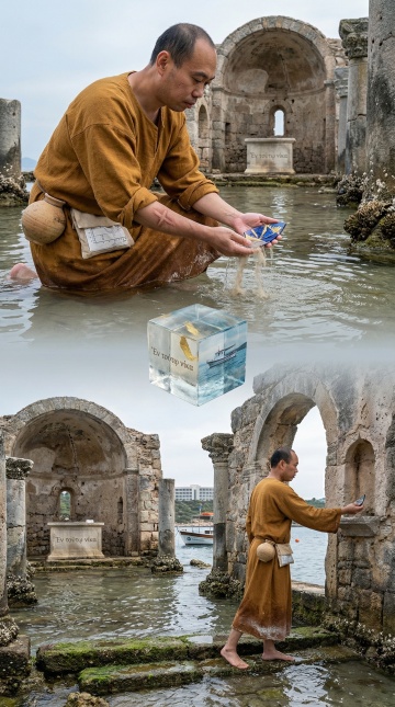 复古与古典交织,静谧中透出神圣。双重曝光与拟人风融合,玻璃立方体悬浮于水彩质感的实景之中,超现实主义呈现时空交错的仪式感。
