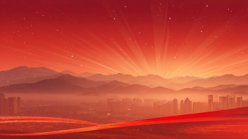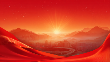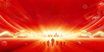 党建主题插画,金色剪影人物群像,左侧人物高举飘扬的黄色旗帜,右侧人物手持步枪,整体姿态昂扬向上,红色渐变波浪形背景从底部向右上方延伸,白色背景点缀金色颗粒质感,光影柔和,氛围庄重而充满力量,扁平化设计风格,简洁有力的视觉语言,突出革命精神与团结奋进的主题。