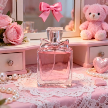 高清摄影风格,透明玻璃香水瓶,瓶身呈方形略带弧度,内装淡粉色液体,银色金属喷头与圆形透明瓶盖,瓶身置于柔和褶皱的浅粉色丝质布料上,布料上散落着几朵白色盛开的花朵,背景为渐变的浅蓝色调,带有柔和的光线斜射形成的光斑和阴影,整体营造出清新、优雅、浪漫的氛围,光线明亮柔和,突出香水瓶的透明质感与液体的色泽,画面构图简洁,主体清晰,细节丰富,具有高端香水广告的精致感与视觉吸引力。