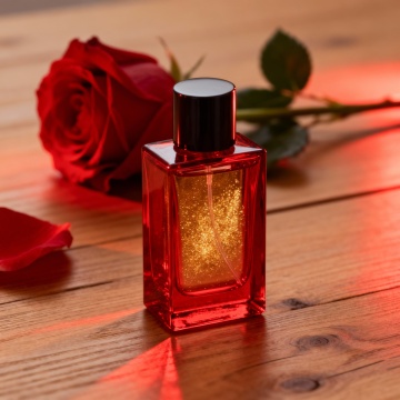 玻璃风香水瓶搭配金属质感瓶盖,置于丝绒礼盒之上,玫瑰花瓣环绕,光影交错间尽显奢华与浪漫,唯美感与梦幻感交织,极繁主义细节诠释优雅。