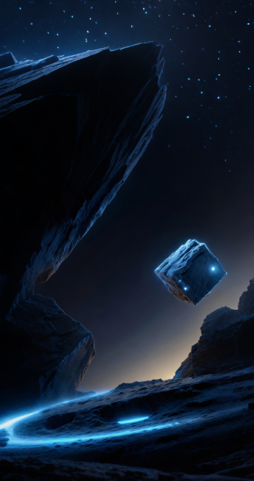 深邃宇宙星空背景,点缀着朦胧星球与闪烁星辰,地平线上是起伏的灰色山峦地貌,表面有细腻纹理,光线从地平线柔和渐变,营造神秘幽静氛围。画面中央是一个展台,展台由黑色基座和光滑的浅色台面组成,台面边缘呈弧形,基座有粗糙质感,整体设计简约现代,展台下方有水面倒影,与星空和山峦形成和谐的科幻场景,整体色调以深蓝、灰色为主,光影过渡自然,具有高级3D渲染的细腻质感和空旷辽阔的视觉效果。