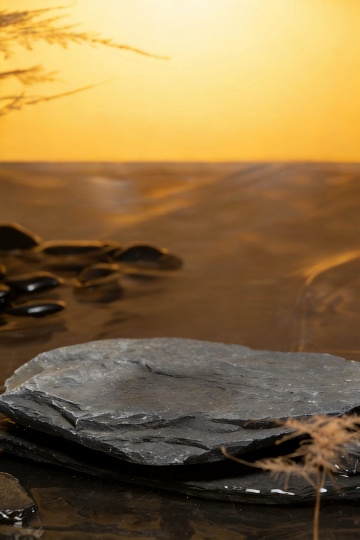 超写实3D渲染风格的岩石背景,深灰与浅棕的岩石表面带有细腻的纹理和自然的光影变化,顶部呈现渐变的暖橙色天空过渡到下方的浅灰色背景,底部有光滑的深色水面倒映岩石,不同场景下岩石以多样角度错落分布,形成自然的空间层次,整体氛围宁静而富有质感,光线柔和地从岩石间隙洒落,营造出极简而高级的视觉效果。
