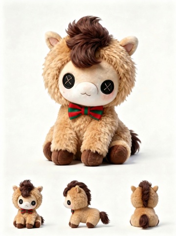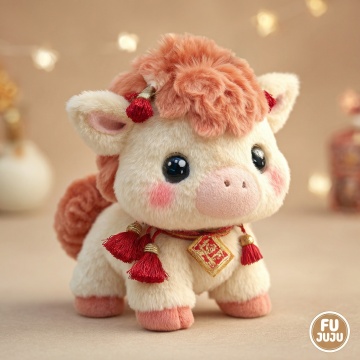 软3D风卡通小马,毛发生长质感,配以刺绣鞍垫与铃铛装饰,融合可爱、梦幻与温馨感,节日氛围浓厚。