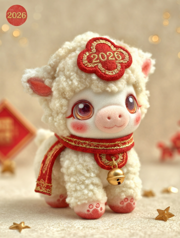 软3D风萌马,毛绒毛毡质感,国潮刺绣元素,红金配色喜庆可爱,2026新春主题卡通福马设计。