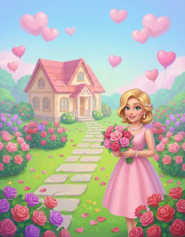 梦幻软3D风,心形霓虹灯与气球点缀,甜美浪漫的情人节场景。