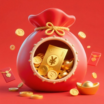 3D国潮风设计,鎏金金属质感钱币与红包满溢,重拟物风格呈现喜庆春节氛围,象征财富与祝福。