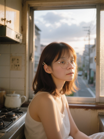 胶片质感的东亚风厨房场景,暖光洒落,营造出柔和舒适的文艺氛围,光影交错间尽显生活静谧之美。