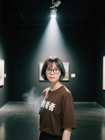 光影交错的展厅中,人物静立于聚光灯下,身穿印有“观看者”的T恤,烟雾缭绕,营造出文艺静谧的实景氛围,融合大字风与印刷风设计,传递深邃的视觉叙事。