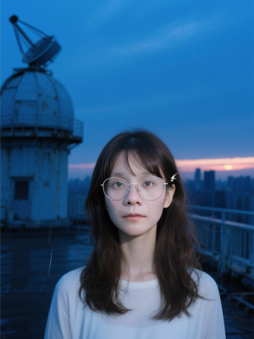 胶片风质感,蓝调暮色中少女凝视镜头,光影朦胧,静谧与文艺交织,实景感十足,城市天际线隐现,诉说都市边缘的诗意。