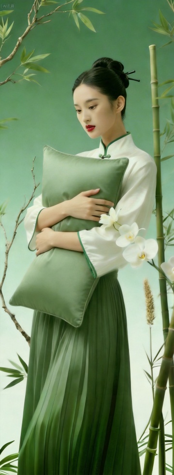 工笔风仕女图,刺绣与油画质感交融,古典中式美学尽显优雅与唯美,浮雕式发饰点缀,尽展传统节日华韵。