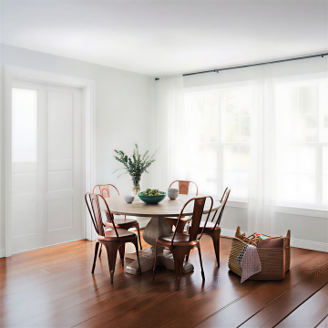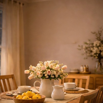 一张木质餐桌,桌面上放着一个装有白色小花的金属花盆,周围摆放着四把木质餐椅,整体呈现出温馨自然的原木风格。光线明亮柔和,从侧面窗户洒入,照亮了木纹的细腻肌理,营造出舒适惬意的氛围。