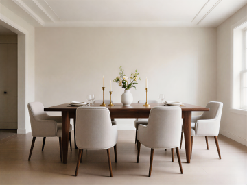 明亮通透的现代简约风格餐厅内部场景,以白色和浅木色为主色调,自然光透过大面积落地窗洒入室内,天花板悬挂着线条简洁的几何形白色吊灯,中央区域摆放着铺有浅色亚麻桌布的圆形餐桌,搭配浅灰色布艺餐椅,餐桌中央点缀着小型绿植花艺,靠墙设置悬浮式浅木色餐边柜,陈列着精致的玻璃器皿,角落处放置一个造型简约的藤编花瓶,插有几支白色和浅粉色的长茎鲜花,地面铺设浅色木地板,整体空间干净整洁、温馨舒适,充满自然清新的气息。