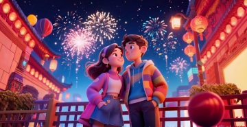 卡通感十足的软3D风设计,男孩手持啤酒,街头夜市氛围浓厚,温馨而生动。