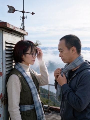 胶片风质感,东亚风叙事,工业感小屋与云海相映,柔和光影中透出质朴文艺气息,实景感十足的静谧瞬间。