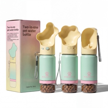 清新淡雅色系搭配可爱爪印元素,扁平与轻拟物结合设计,简约塑料质感瓶身,传递舒适治愈感,适合宠物出行场景。