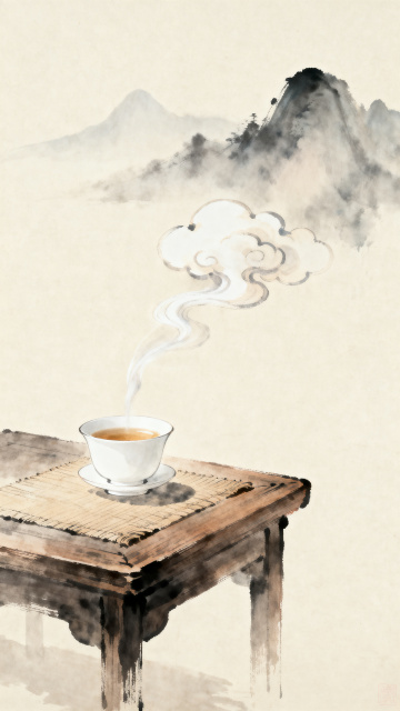 淡雅中国风插画风格,四个不同样式的青瓷茶杯,杯身分别饰有山水、花鸟、书法、缠枝莲纹样,温润通透的白瓷底色,青绿色调清新雅致,柔和的光影效果,杯内盛有淡绿色茶汤,杯口飘散着袅袅热气,周围点缀着新鲜的翠绿茶叶,叶片上带有晶莹的露珠,整体构图疏密有致,营造出宁静自然的茶文化氛围,线条细腻流畅,色彩过渡柔和,具有传统工笔画的细腻质感和现代插画的简洁美感,背景为纯白色。