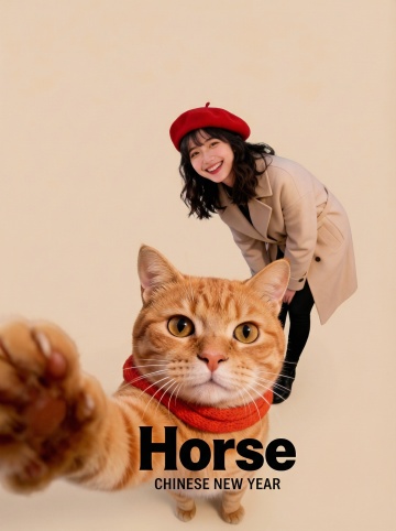 拟人风猫咪戴红围巾虔诚祈福,毛发生长质感路牌叠满新年祝福,面料风雪景烘托喜庆温馨氛围,窗外烟花绽放迎接2026。