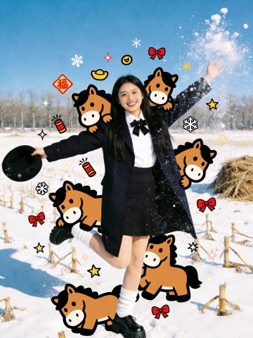 插画风与emoji风融合,卡通小马、红包、雪flake环绕,营造可爱喜庆的梦幻氛围,拼贴手法增添趣味感,冬日雪景中尽显节日欢乐。