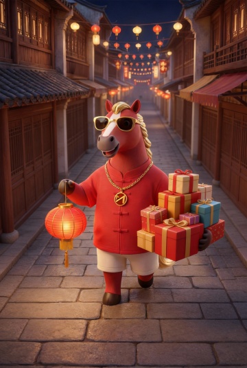 软3D风拟人马穿国潮红袍骑锦鲤,喜庆卡通感十足,粒子光效点缀,尽显春节吉祥氛围。