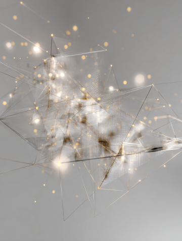 深邃的黑色背景,中央区域有一个明亮的金色光点作为光源,向四周散发柔和的光芒。画面中分布着许多金色的立体几何图形,这些图形呈现出不同的角度和大小,有的向上延伸,有的向两侧展开,形成一种空间感和层次感。金色的线条勾勒出几何图形的轮廓,边缘光滑且具有金属光泽。背景中还点缀着许多细小的金色光斑,如同星尘般散布在黑色的空间中,营造出一种华丽而神秘的氛围。整体画面色彩对比强烈,金色的元素在黑色的背景上显得格外耀眼,给人一种高端、大气的视觉感受。