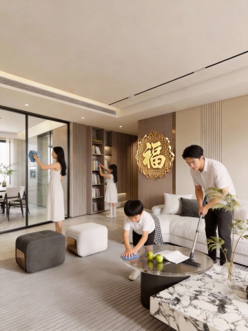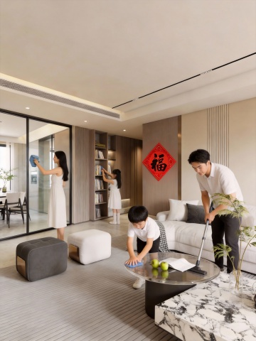 极简主义风格的室内背景,柔和的米白色墙面搭配浅木色人字拼地板,自然光透过米白色半透明窗帘洒入,营造出明亮通透、宁静舒适的氛围。房间中央摆放着一组不同设计的浅灰色布艺沙发,搭配深绿色和浅蓝色的几何图案靠垫,沙发前是一张椭圆形的黑色大理石茶几,上面放置着一个造型简约的玻璃花瓶,插着几支干枯的芦苇。墙上悬挂着一幅抽象风格的装饰画,画面以深蓝色和金色为主色调,呈现出流动的线条感。房间另一侧的墙角摆放着一盆高大的琴叶榕,种植在一个哑光白色的陶瓷花盆中。天花板上安装着一盏造型独特的黑色金属吊灯,灯光温暖柔和。整个空间的配色以低饱和度的灰色、蓝色和绿色为主,搭配原木色的自然质感,展现出简约而不失高级感的现代设计美学。