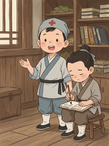 古典中式工笔风,水墨渲染静谧文艺场景,师徒共学,书香满堂。