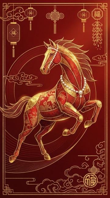 鎏金浮雕风骏马踏云,工笔描边勾勒古典韵味,红金配色尽显中式奢华与民族优雅,唯美复古中透出祥瑞之气。