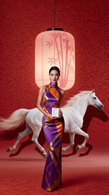 3D风重拟物设计,鎏金与玻璃质感交织,马头人形模特持巨型口红登台,舞台灯光璀璨,综艺感十足,喜庆奢华中透出梦幻时尚气息。