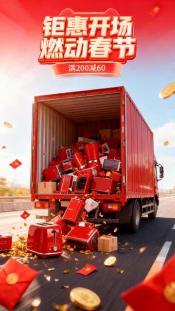 国潮风与霓虹灯风融合,3D重拟物设计,龙形购物车满载红包金锭,穿梭于未来都市,喜庆科技感十足,限时促销氛围热烈。