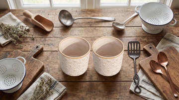 一个温馨明亮的北欧风格厨房局部场景,以浅米色墙面为背景,顶部悬挂着木质搁板,上面整齐摆放着白色陶瓷罐、带木盖的储物罐和两个大小不一的棕色陶罐,搁板下的白色橱柜带有简约的金属旋钮,橱柜台面中央放置着一大一小两块原木色木质砧板,左侧有一个装着木制厨具的白色容器,整体采用柔和的自然光照明,光线从右上方斜射下来,在墙面和物体上形成清晰而柔和的阴影,营造出温暖、整洁、舒适的居家氛围,画面下方是浅色木质厨房台面,展现出简约自然的生活美学。