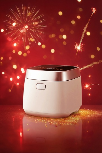 米白色电饭煲,周围环绕厨房台面及新鲜食材(白米、稻穗、绿叶蔬菜),现代简约风格,温馨自然氛围,明亮柔和光线,高清质感,白色背景的要求,