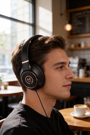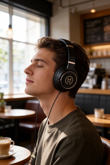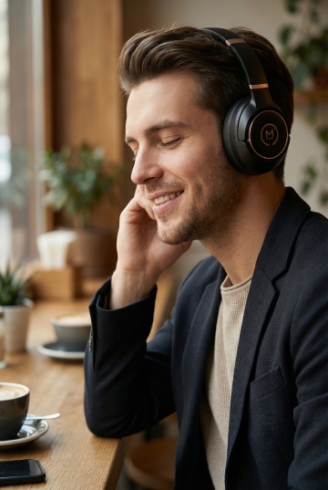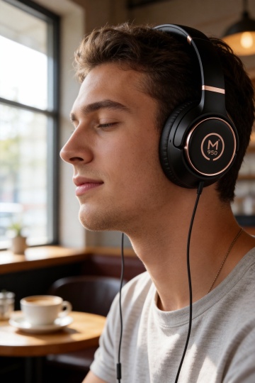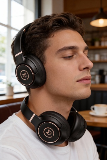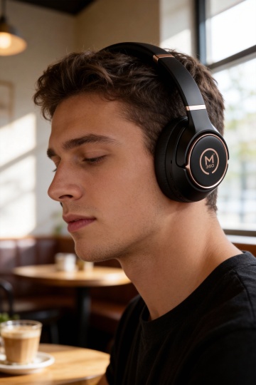 温馨写实风,浅银头戴式耳机与毛绒毯、暖调光影结合,搭配年货节促销标签,营造治愈松弛的促销氛围。