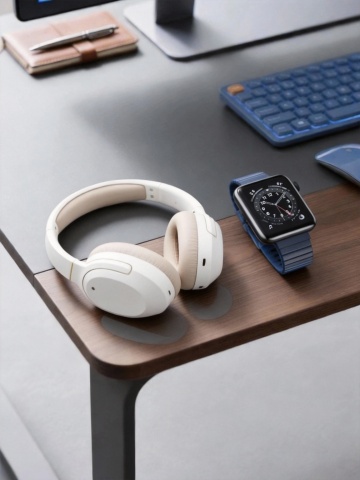 现代感与科技感融合的3D风桌面场景,简约主义设计搭配金属与塑料质感,展现商务氛围中的智能穿戴设备美学。