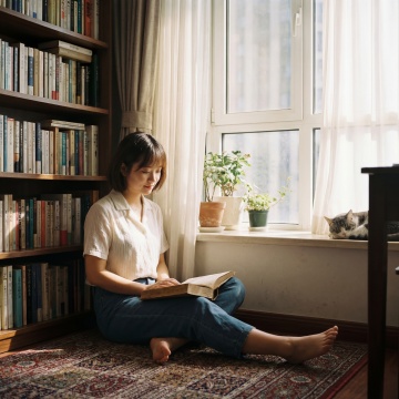 文艺感与光影交织,双重曝光手法营造静谧温馨氛围,拼贴式构图融合油画质感与实景细节,窗边阅读的女子与黑猫共度秋日时光,字句飘浮如诗。