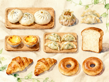 淡黄色背景上,以简约流畅的线条勾勒出多种不同面包纹样,包括切片面包、法棍、牛角包、吐司、圆面包等,搭配少量餐具和水果元素,形成均匀分布、无缝衔接的重复图案,整体风格清新明快,线条简洁连贯,视觉效果统一和谐。