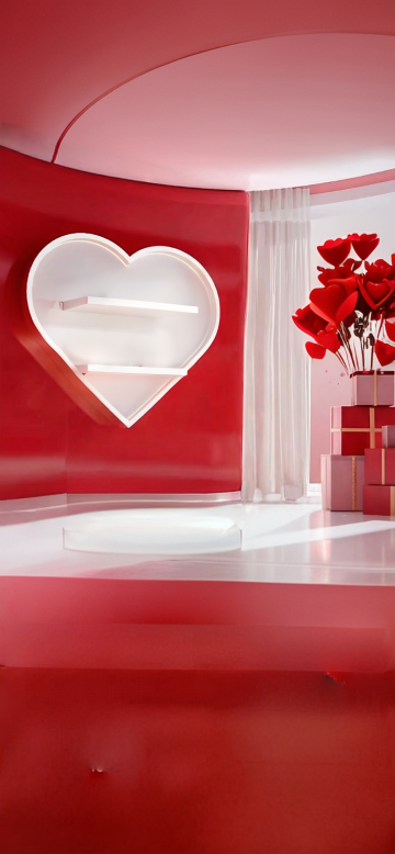 梦幻软3D风,心形霓虹灯与气球点缀,甜美浪漫的情人节场景。