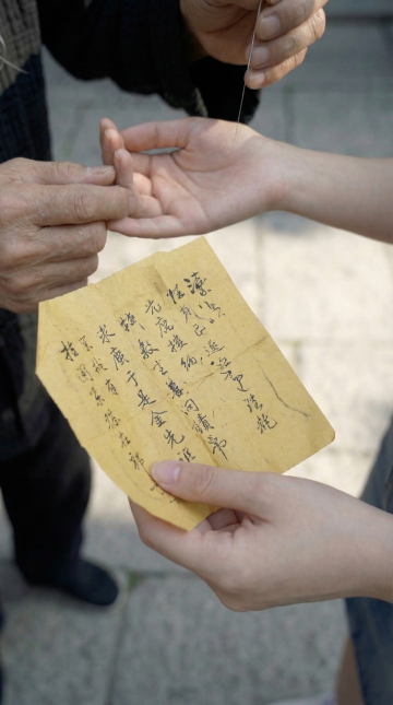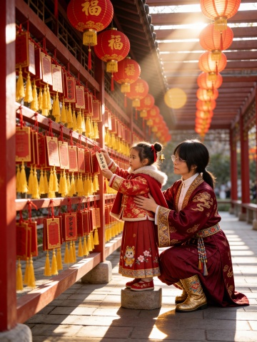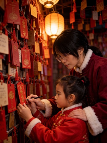 国潮风与刺绣风交融,母女共写祈福牌,红灯笼映衬温馨场景,复古实景中透出浓郁中式喜庆感与民族温情。
