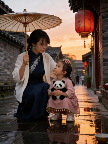 国潮风与刺绣风交融,水墨意境中母女共撑油纸伞,雨巷夕照映暖光,重拟物细节呈现中式古典温馨实景。