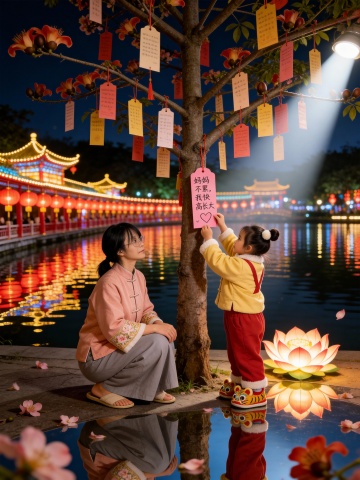 国潮风与重拟物风融合,水彩质感渲染夜景,光影交织映照湖面,中式建筑与灯笼烘托喜庆氛围,母女互动传递温馨梦幻感。