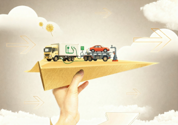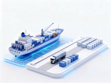 未来感3D微缩艺术风,科技蓝霓虹光效勾勒智能物流场景,金属质感船舶与卡车联动,展现虚拟现实中的高效商务运输。