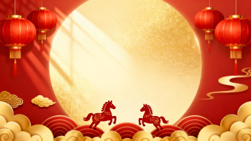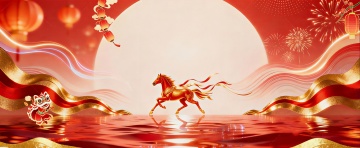中式复古风海报,红金配色尽显喜庆与奢华,重拟物浮雕马踏祥云,搭配灯笼与中国结,国潮金属质感浓厚,节日氛围浓郁。