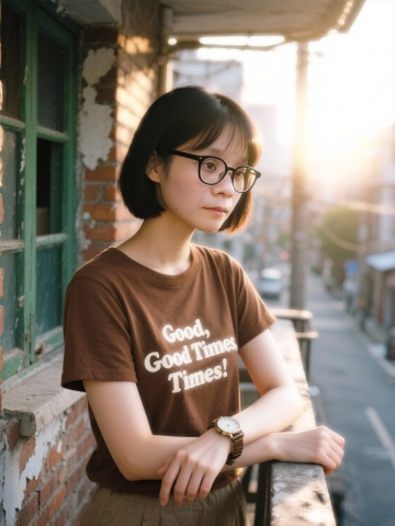 复古胶片风,东亚街巷实景,光影斑驳中透出质朴文艺感,人物静立窗边,暖色调与老旧砖墙呼应,营造怀旧时光氛围。