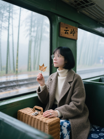 复古胶片风,中式轻拟物设计,雨雾中的绿皮火车窗边,女子手握落叶,静谧文艺感十足,东亚风情与实景质感交织。