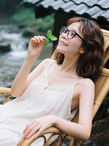 雨中藤椅上的少女,手持绿叶,笑靥如花。水彩风与胶片感交织,光影柔和朦胧,中式庭院静谧唯美,自然与文艺气息扑面而来,尽显清新温柔之韵。